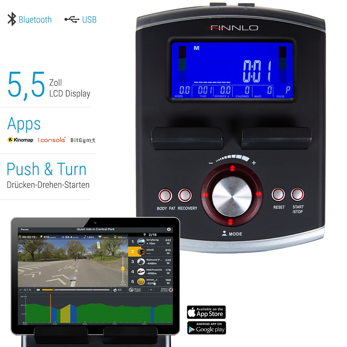 - Apps: BitGym, Kinomap und iConsole, USB-Ladeanschluss