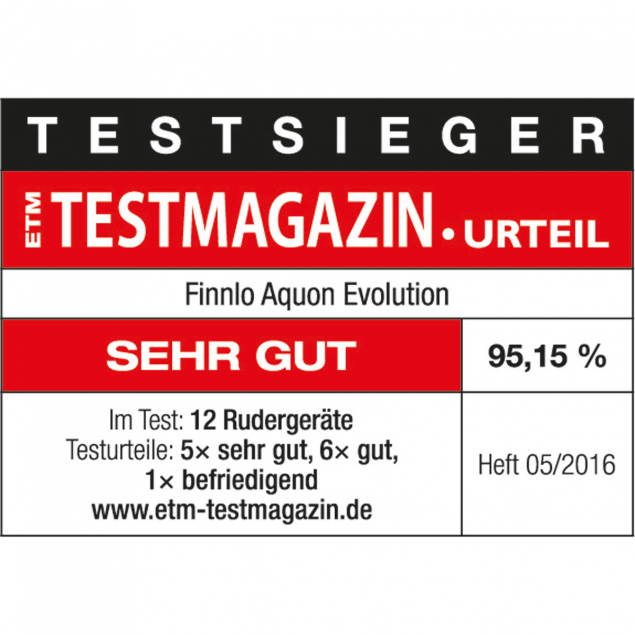 Das ETM-Testmagazine bestätigt die Qualität und kürt unser Rudergerät Aquon Evolution zum Testsieger! Unter 12 getesteten Rudergeräten für den Heimbedarf, schnitt das Aquon Evolution mit einer Bewertung von 95,15 % am besten ab. Das Testmagazin (Ausgabe 05/2016) lobte die einwandfreie Verarbeitung, sowie den ebenmässigen Rundlauf des Rudergeräts.