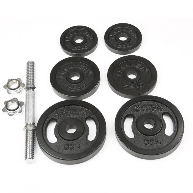 Das HAMMER 20 kg Set besteht aus einer Kurzhantel mit 6 Gewichtsscheiben. Der geriffelte Griff liegt perfekt in der Hand und sorgt für die nötige Griffsicherheit beim Training. Sternverschlüsse mit Gummi-Einlagen sichern die Gewichte gegen ungewolltes Aufdrehen und halten die Scheiben auf Position. Durch schnelles und einfaches Aufdrehen der Verschlüsse, können die Gewichtsscheiben für jede Trainingsübung verringert oder hinzugefügt werden. Kleinere Muskelgruppen wie die Schulter benötigen beispielsweise ein geringeres Trainingsgewicht als der grosse Brustmuskel. Zusätzlich sollte die Intensität für einen stetigen Trainingsfortschritt immer wieder angepasst werden. Diese Variation spricht Muskelgruppen unterschiedlich an und sorgt für einen neuen Trainingsreiz.