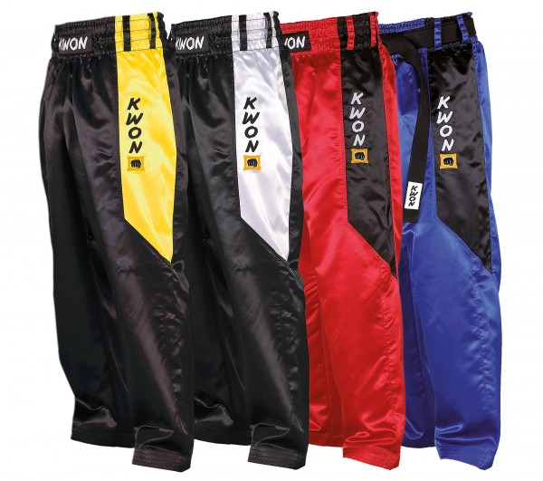 Aufwändig designte Satin Hosen / Kickboxhosen im weiten Schnitt aus 100% glänzendem Polyestermaterial zum hervorragenden Preis und in sehr guter Verarbeitung.