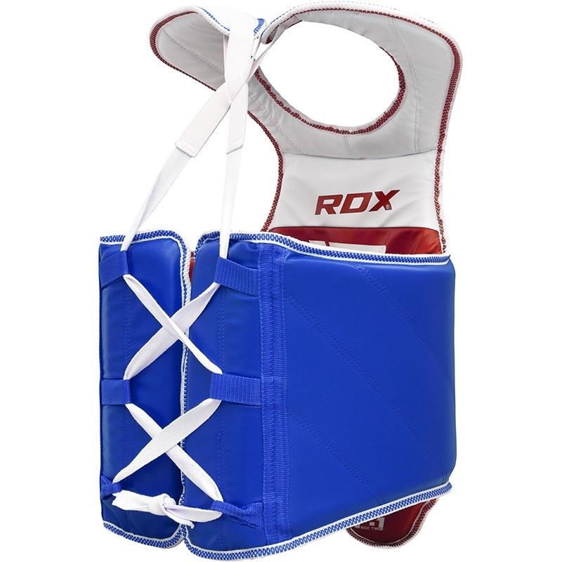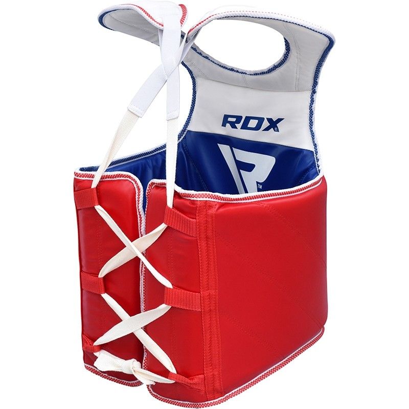 RDX latest editions in protective Taekwondo gear will give you all the confidence you need to train against TKD’s vicious kicks. Double-sided, Patented Maya Hide leather is triple-stitched using nylon thread with nylon piping to combat bone shattering impact of taekwondo strikes. Hi-tech compressed foam padding further laminated with foam cushioning translates into the most durable chest guard protector a TKD practitioner could dream of. (EXTRA SMALL & SMALL SIZES RECOMMENDED FOR UP TO 14 YEARS OF AGE)